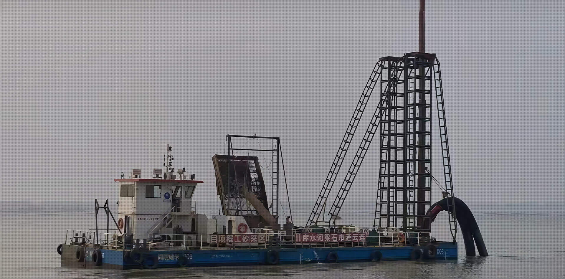 設計新穎,操作簡便,效率高,適用于河道疏浚、湖泊水庫清淤、圍海造田、港口碼頭清理、抽砂等。該設備由船體、輸送系統、進水系統、排空系統等組成,輸送系統包括動力、離合器、泥漿泵等,排空系統包括高壓水泵、抽真空裝置等。